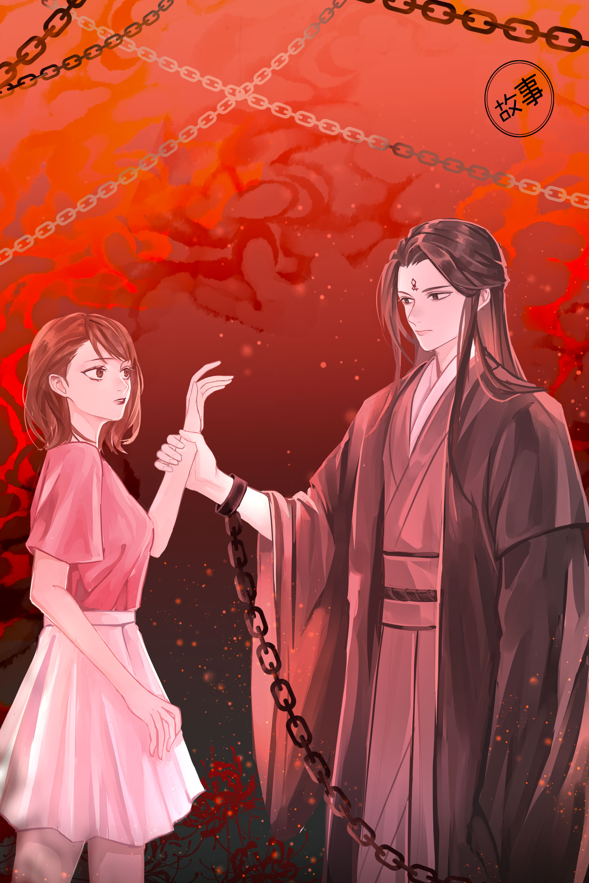 那人的脚下未动,就这么把那沾染了多条人命的行尸鬼给带走了,顿时只让人觉得周遭瞬间寒气逼人,仿佛空气都要凝结成冰。更诡异的是,那人长发黑袍,眉心是一道红色的双鱼枷锁的印记,而他的手上,脚上,皆拖拽着沉重的寒铁铐链,受那沉重铐链束缚着。